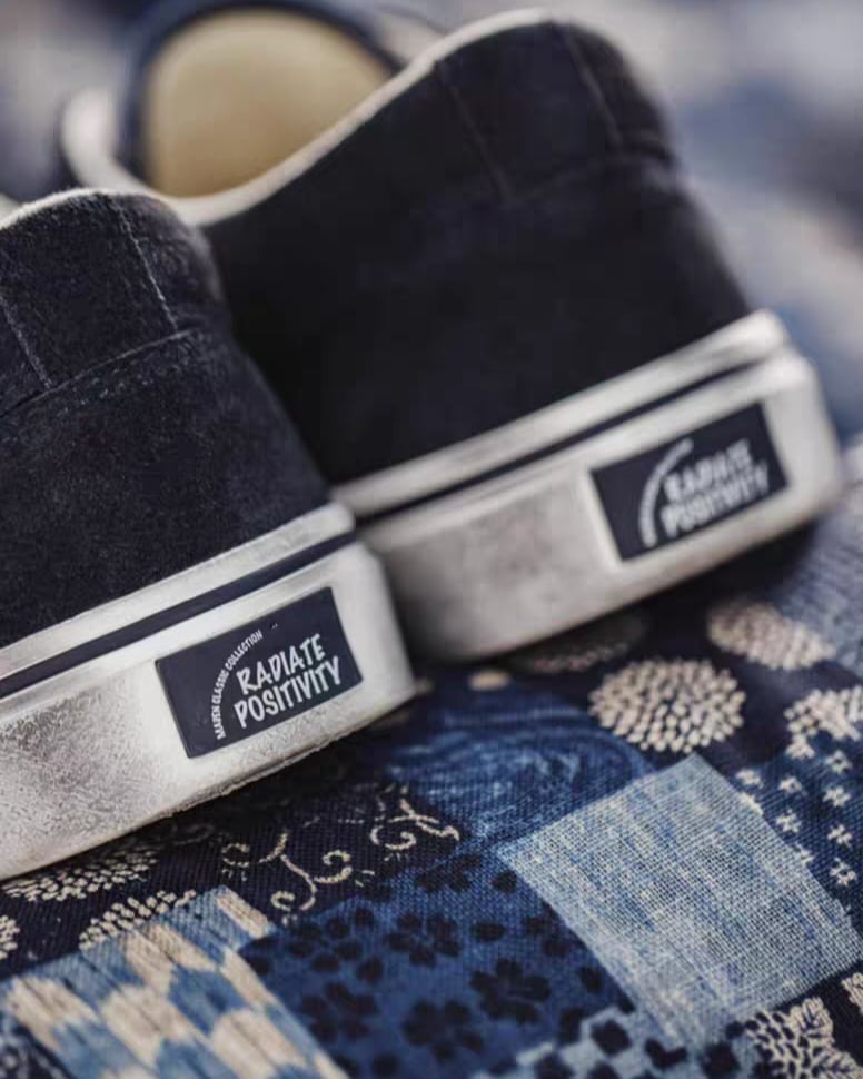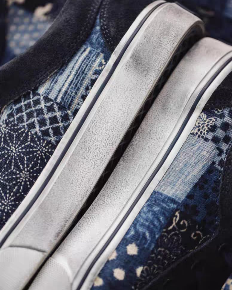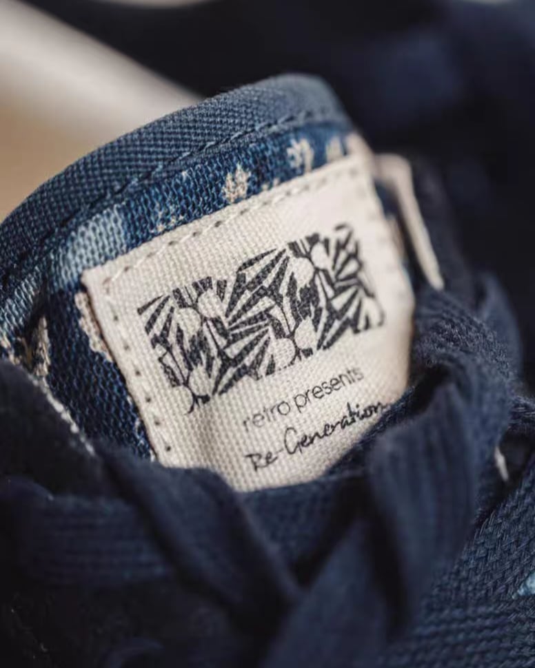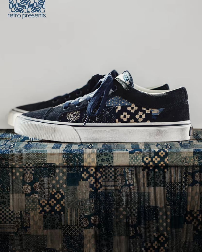 ネイビーのキャンバス素材に、伝統的なボロスタイルのパターンが映えるスニーカー。