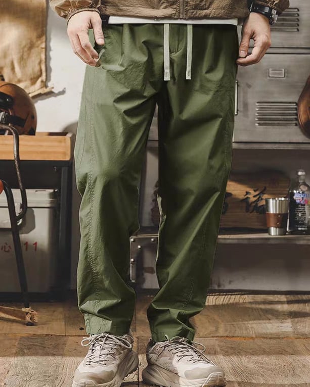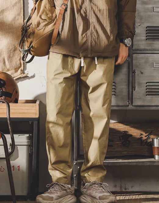 ウエストはエラスティック仕様とドローストリングで調整可能。動きやすさを追求した設計で、デイリーユースからアウトドアまで幅広く活躍する一本。