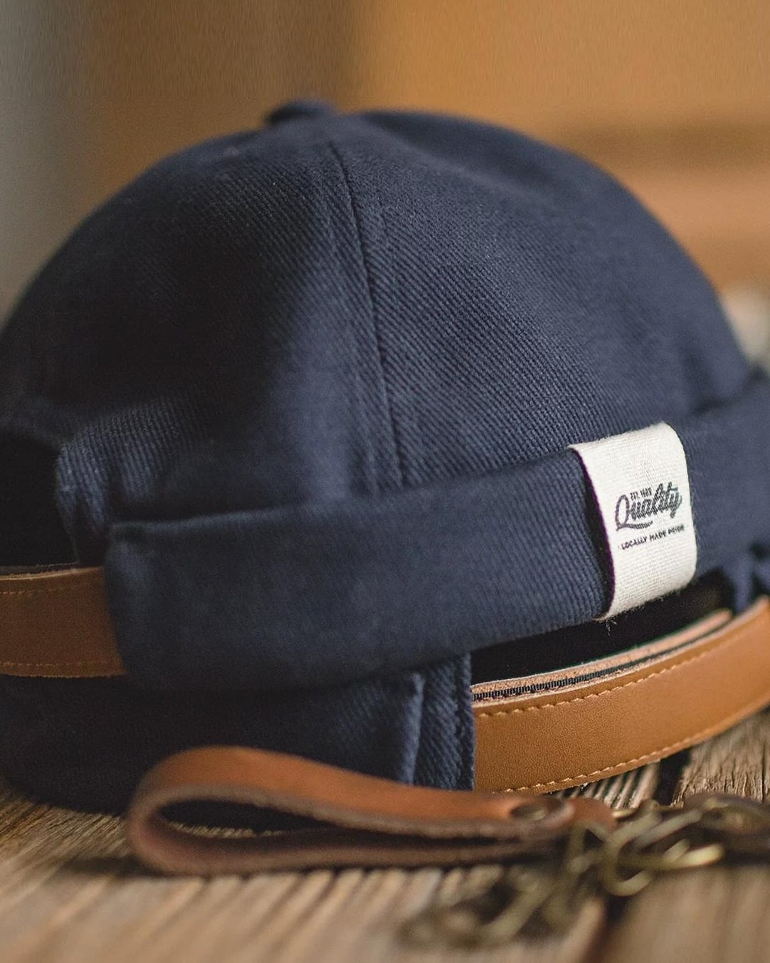 173cm/79kg、胸囲90cm・ウエスト85cmの店主が、深みのあるネイビーの色気と、背面にあしらわれたレザーストラップの「本物感」に惹かれてセレクトしました。被るだけで顔周りをキリリと引き締め、落ち着いた男の風格を添えてくれる一品です。