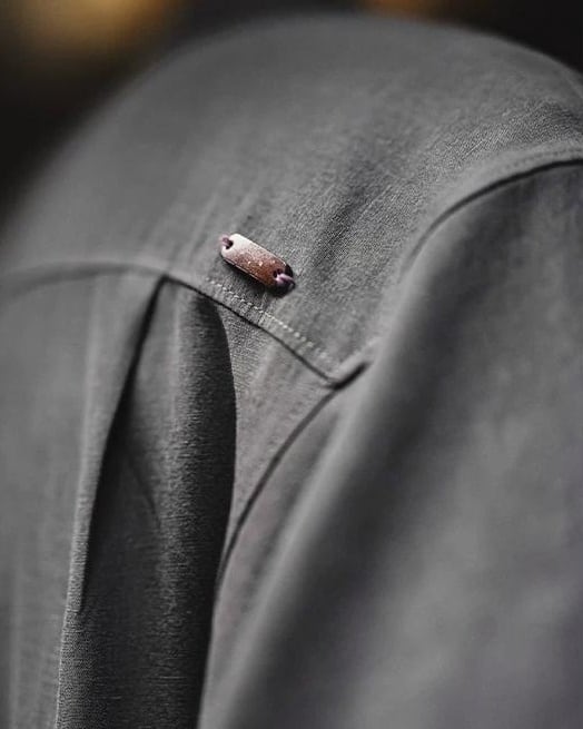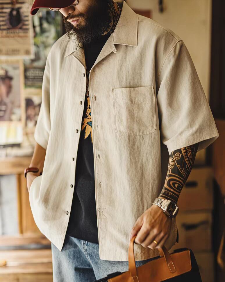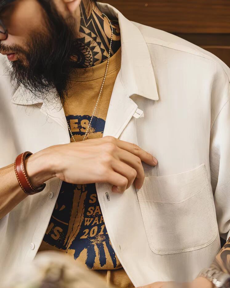 「ディテール」に宿る品格: クラシックなキューバカラーのデザインが、顔周りにほどよい抜け感をプラス。胸元のポケットや丁寧な仕立てが、シンプルながらも「こだわり」を感じさせる、大人のためのリラックススタイルを形作ります。